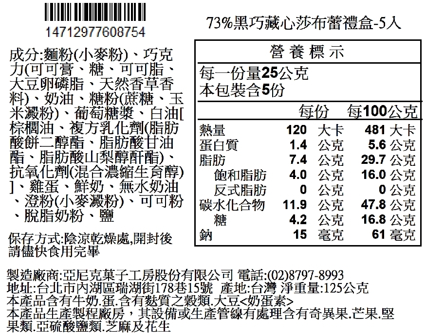 主要內容物:巧克力莎布蕾餅乾/ 73%比利時巧克力餡/73%巧克力