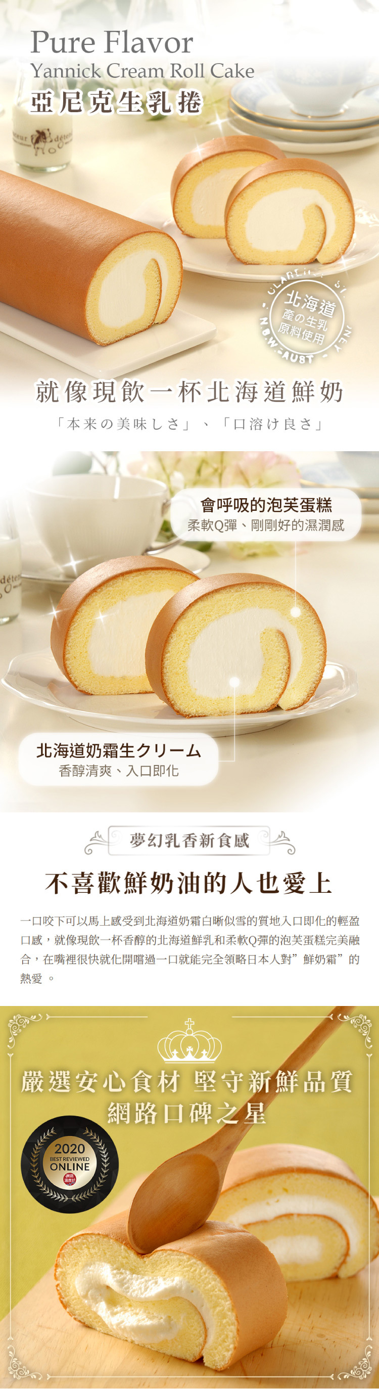 嚴選保濕性絕佳的日本昭和蛋糕專用麵粉,麵糰經過「燙麵」改變筋性,讓蛋糕口感柔軟不失彈性,潤口不黏膩,剛剛好的蛋糕厚度與北海道奶霜完美融合,引領絕佳口感。