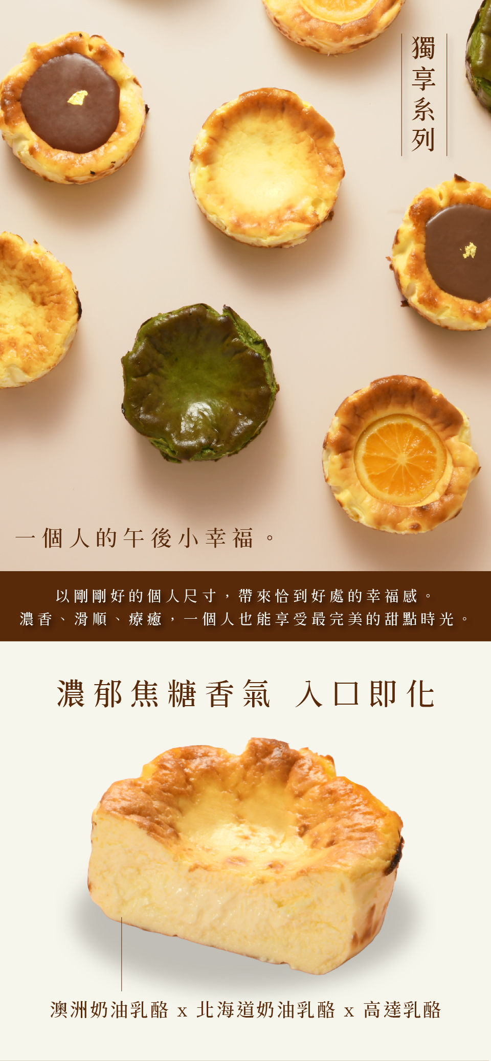 特別挑選北海道生起司、高達熟成起司製成,焦黑的表層讓起司洋溢著濃郁的焦糖香氣,半熟口感入口即化,剛剛好的份量,一不小心,整顆就吃完了!