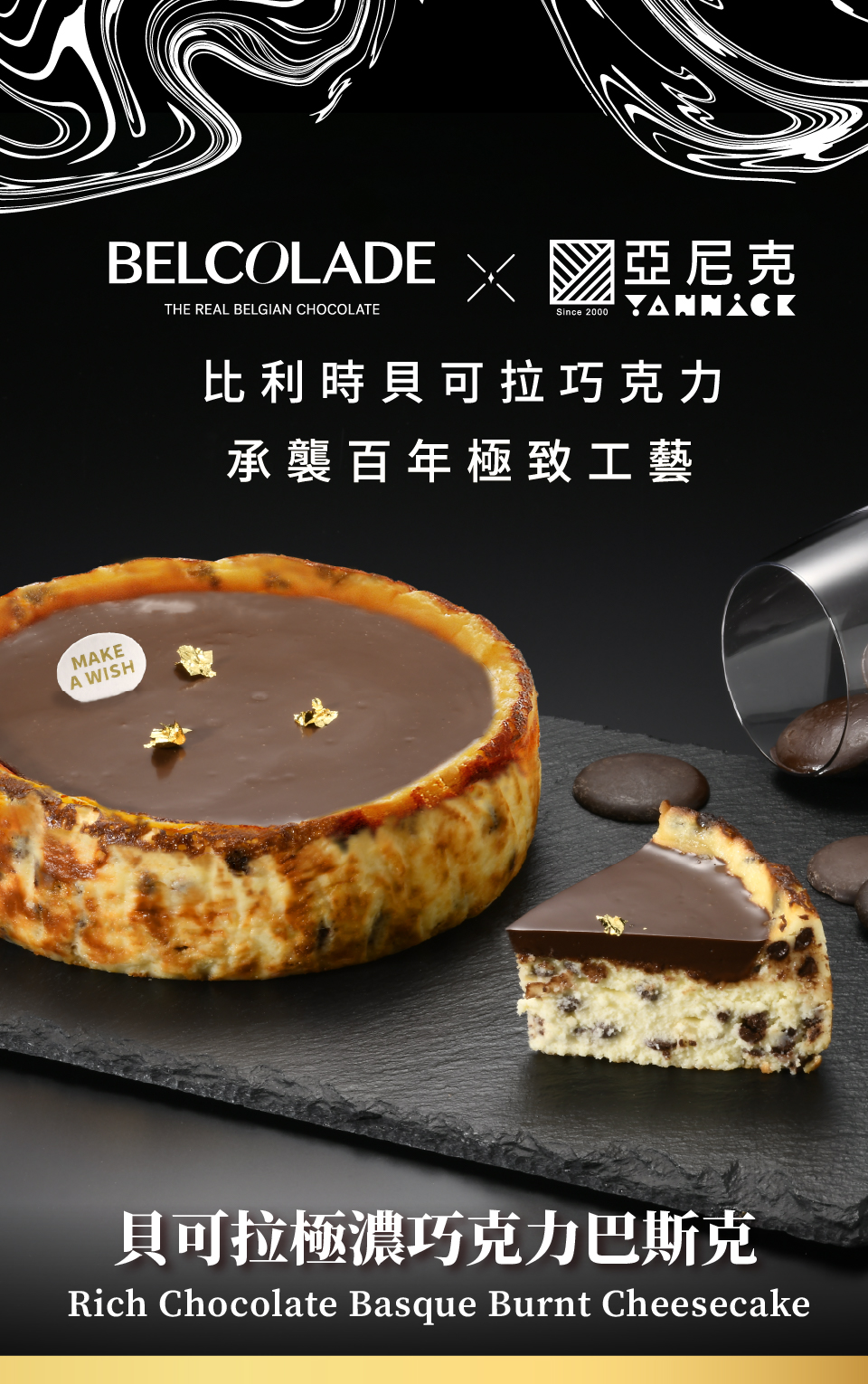濃郁膏狀的巧克力流心質地綿細,與底層的巴斯克起司在嘴裡融合時猶如你濃我濃的愛戀,不僅滋味合拍,也保留彼此的風味個性。