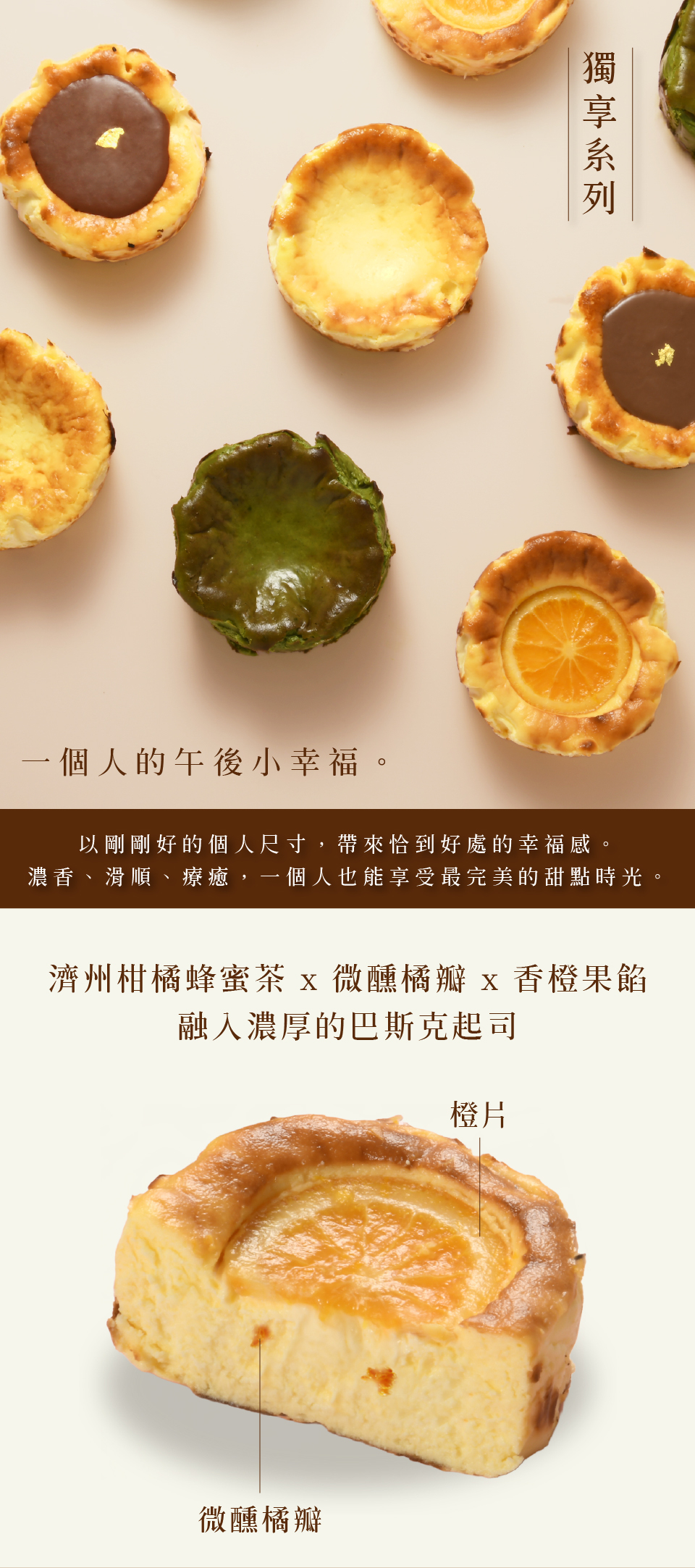 把濟州柑橘茶、微醺橘瓣與香橙果餡融入濃厚的巴斯克起司裡,柑橘的酸與果香帶出起司的微酸與奶香。外層焦香、內裡近半熟般的融口質地,在柑橘香氣的牽引下濃郁卻不膩口,佐一杯咖啡,享受片刻的陽光心情。剛剛好的份量,一不小心,整顆就吃完了!