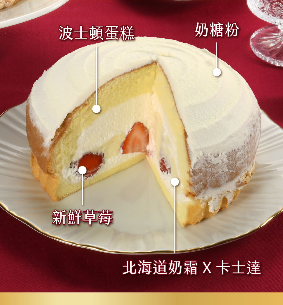 主要內容物:波士頓蛋糕/新鮮草莓/北海道奶霜/卡士達/奶糖粉/巧克力裝飾片