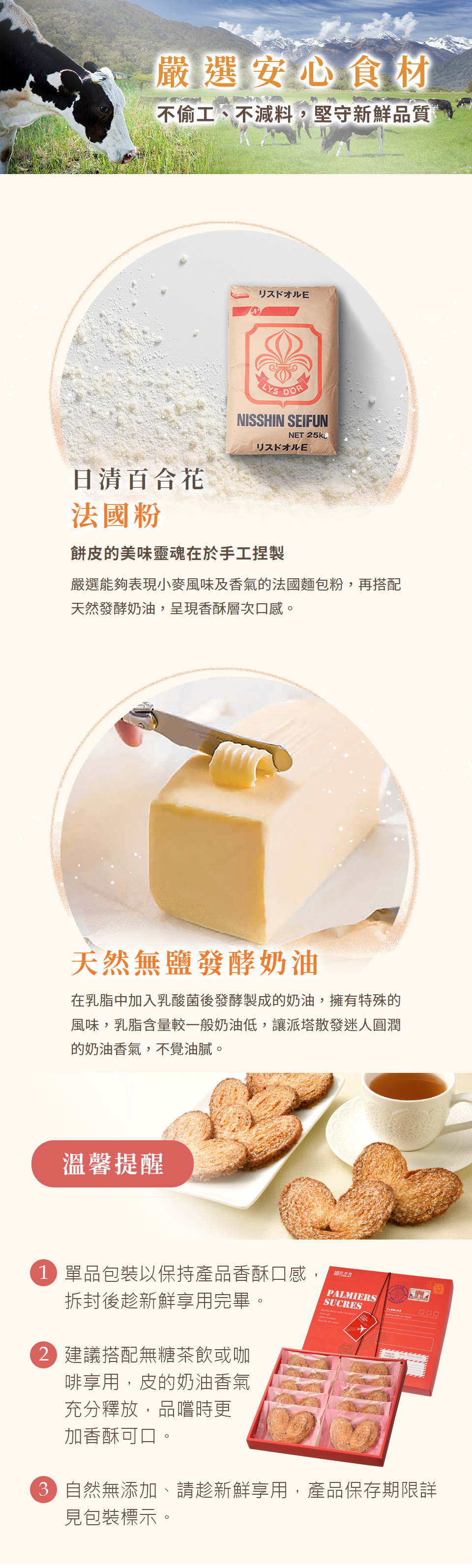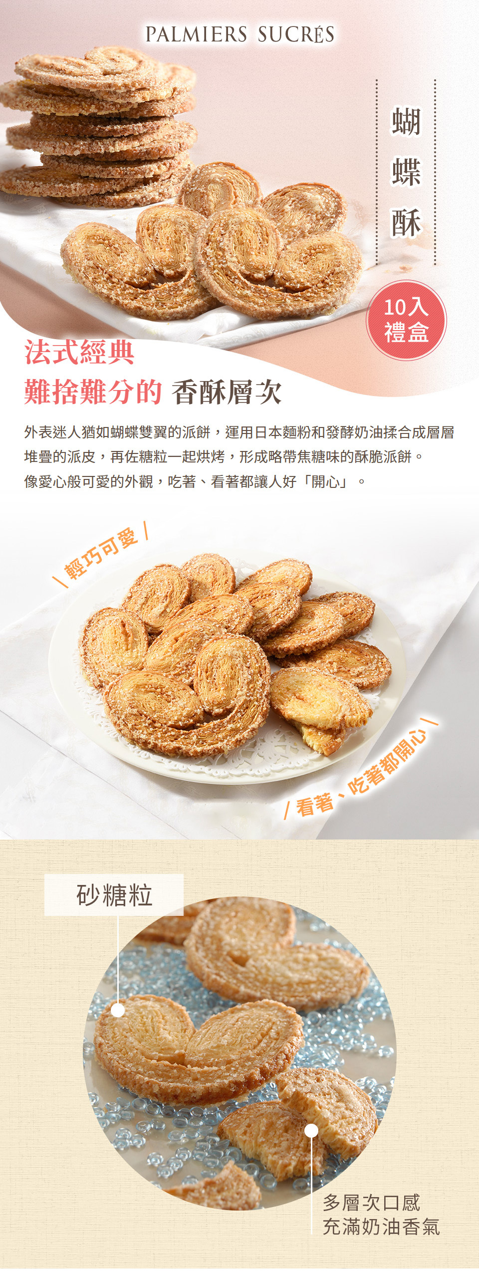外表迷人猶如蝴蝶雙翼的派餅,擁有讓人難捨難分的脆口美味,是經典法式甜點。運用麵粉和發酵奶油揉合成層層堆疊的派皮,再佐糖粒一起經過高溫烘烤,形成略帶焦糖味的酥脆派餅,香酥爽口,甜而不膩。能同時享受到細緻的奶油香氣及糖粒帶來的層次口感。