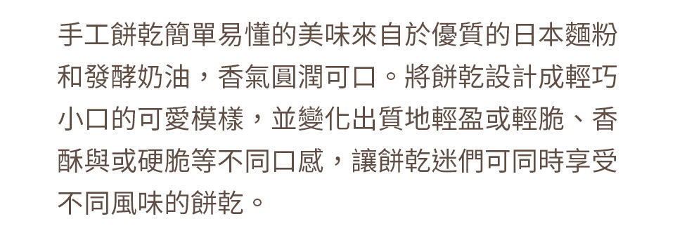 將餅乾設計成輕巧小口的可愛模樣,並變化出質地輕盈或輕脆、香酥與或硬脆等不同口感,讓餅乾迷們可同時享受不同風味的餅乾。