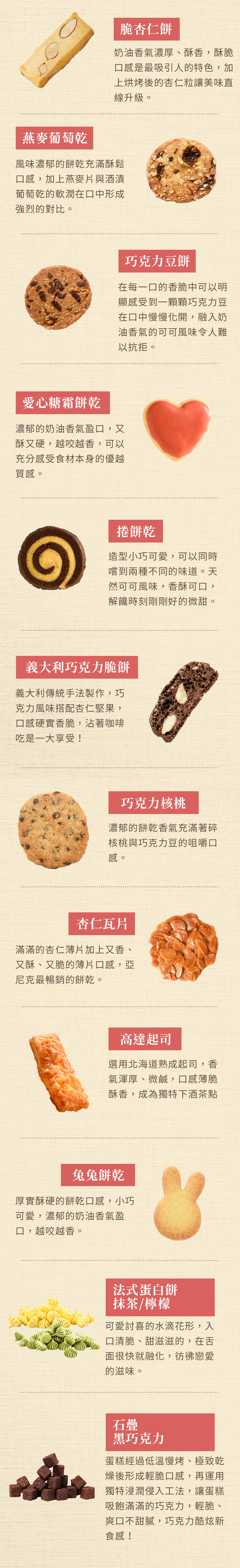 主要內容物:巧克力杏仁/捲餅乾/燕麥葡萄/愛心糖霜/脆杏仁餅/義大利巧克力脆餅/梅子奶油餅乾(櫻花)/杏仁瓦片/帕馬森起司/兔兔/法式蛋白餅-靜岡抹茶/梅子奶油餅乾(新年快樂)/石疊-黑巧克力