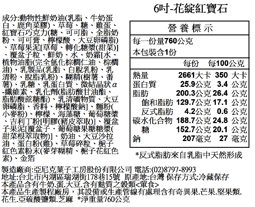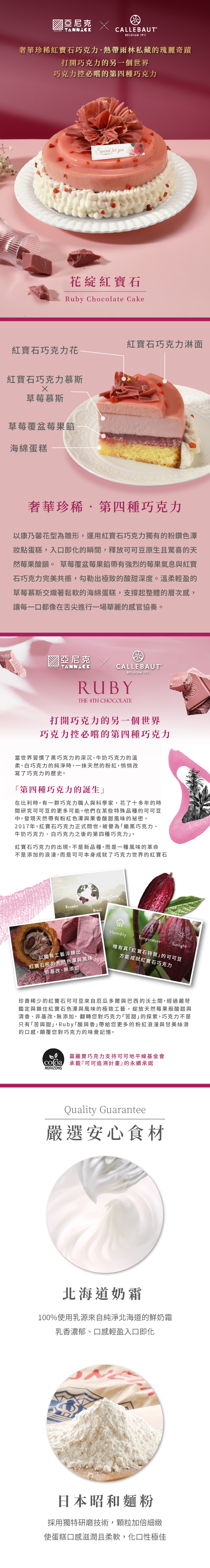 主要內容物:紅寶石巧克力花/紅寶石巧克力淋面/海綿蛋糕/草莓覆盆莓果餡/紅寶石巧克力慕斯/草莓慕斯