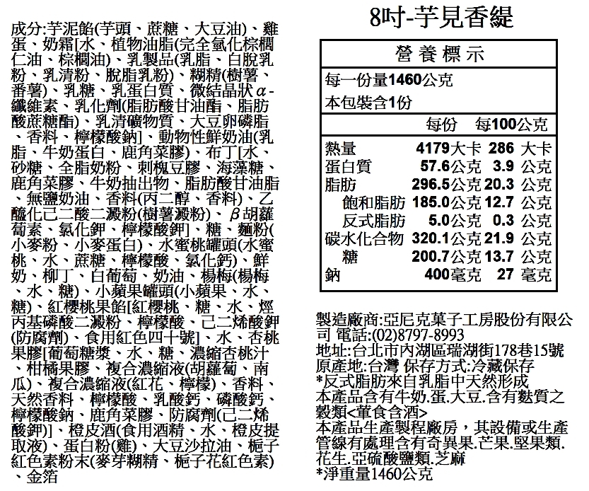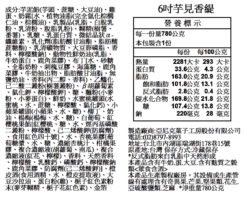 主要內容物:綜合水果/磅蛋糕屑/泡芙蛋糕/芋泥奶霜/布丁/北海道奶霜/法國鮮奶油