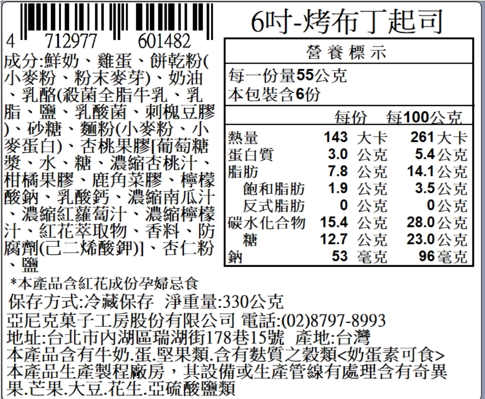 主要內容物:奶油起司/鮮奶/蛋/杏仁奶油派塔
